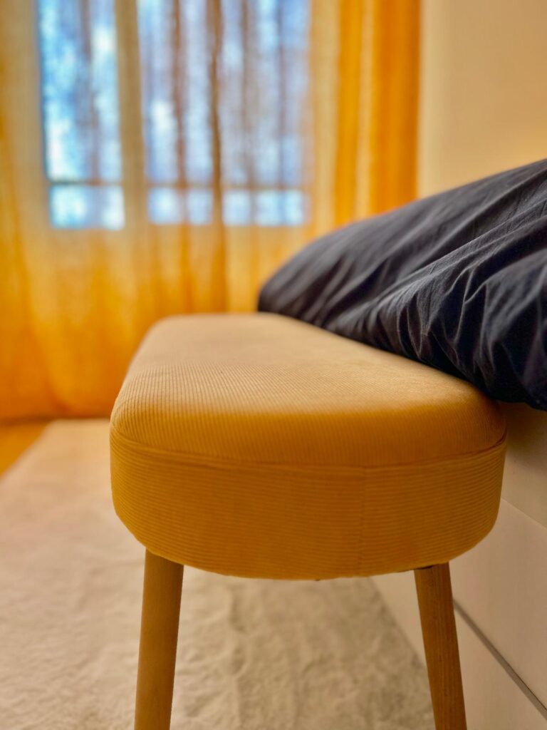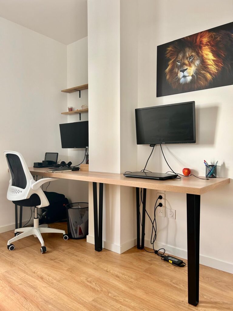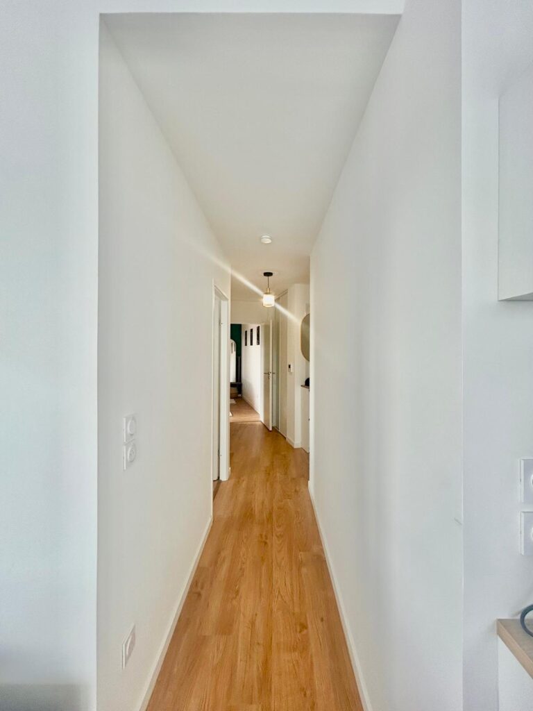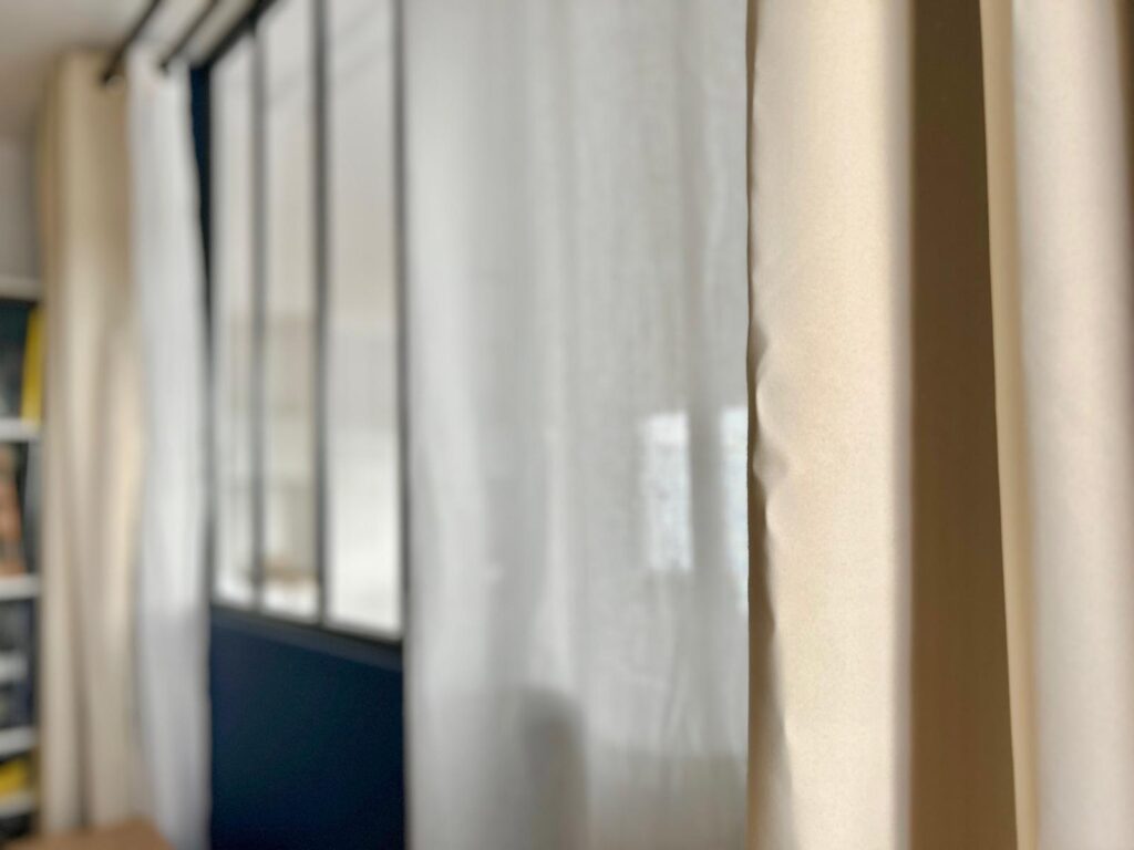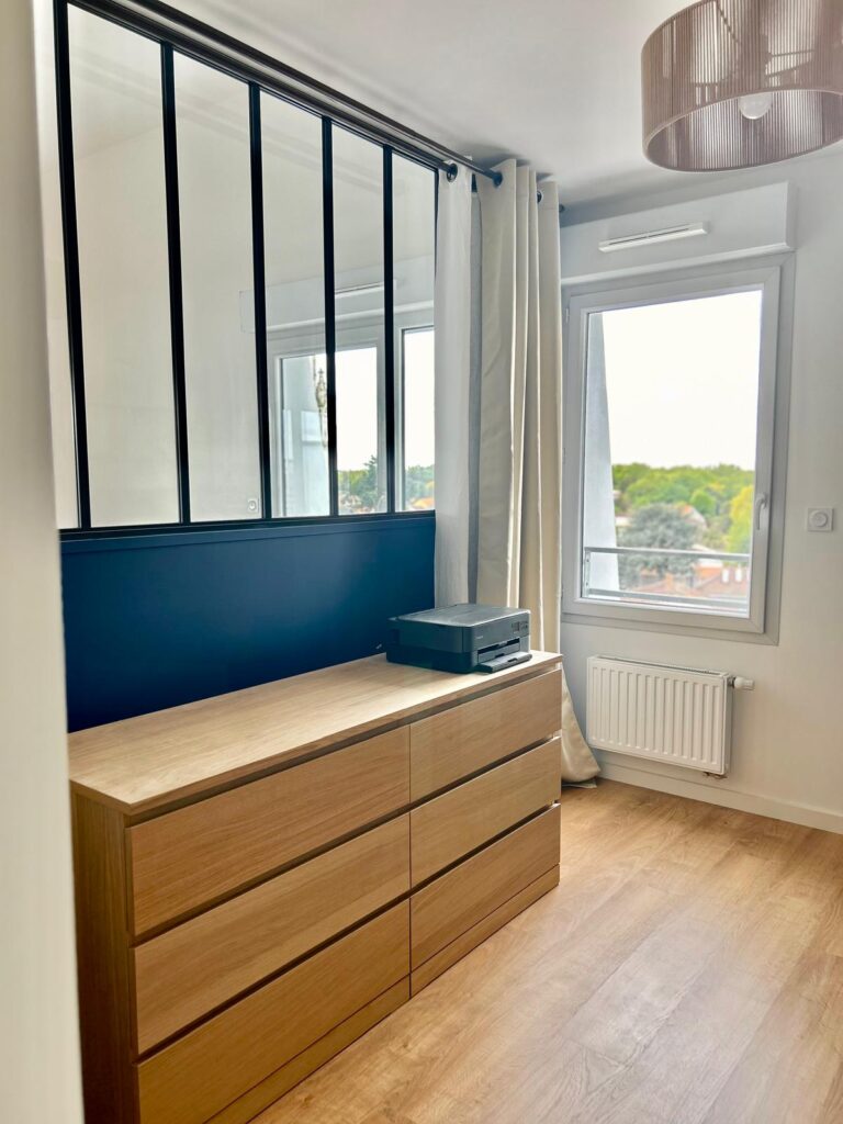 Dans l’espace bureau, une solution sur mesure a été élaborée pour composer avec la présence d’une poutre porteuse, qui a été astucieusement intégrée comme séparateur entre les deux postes de travail. Cette configuration a été choisie afin de ne pas perturber la circulation naturelle de l’espace. Un mur d’accent bleu nuit a été introduit, apportant une nouvelle dimension visuelle et un caractère affirmé à la verrière. En parallèle, l’installation de rideaux sur mesure en gaze de coton et suédine dans des teintes nudes, prévoit l’accueil futur d’un canapé-lit. Cette solution polyvalente permettra de transformer l’espace bureau en une confortable chambre d’amis, offrant ainsi une flexibilité optimale dans l’utilisation de cet espace.