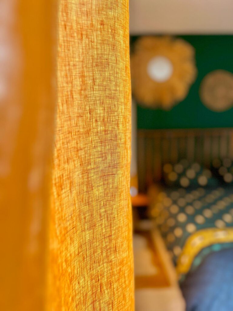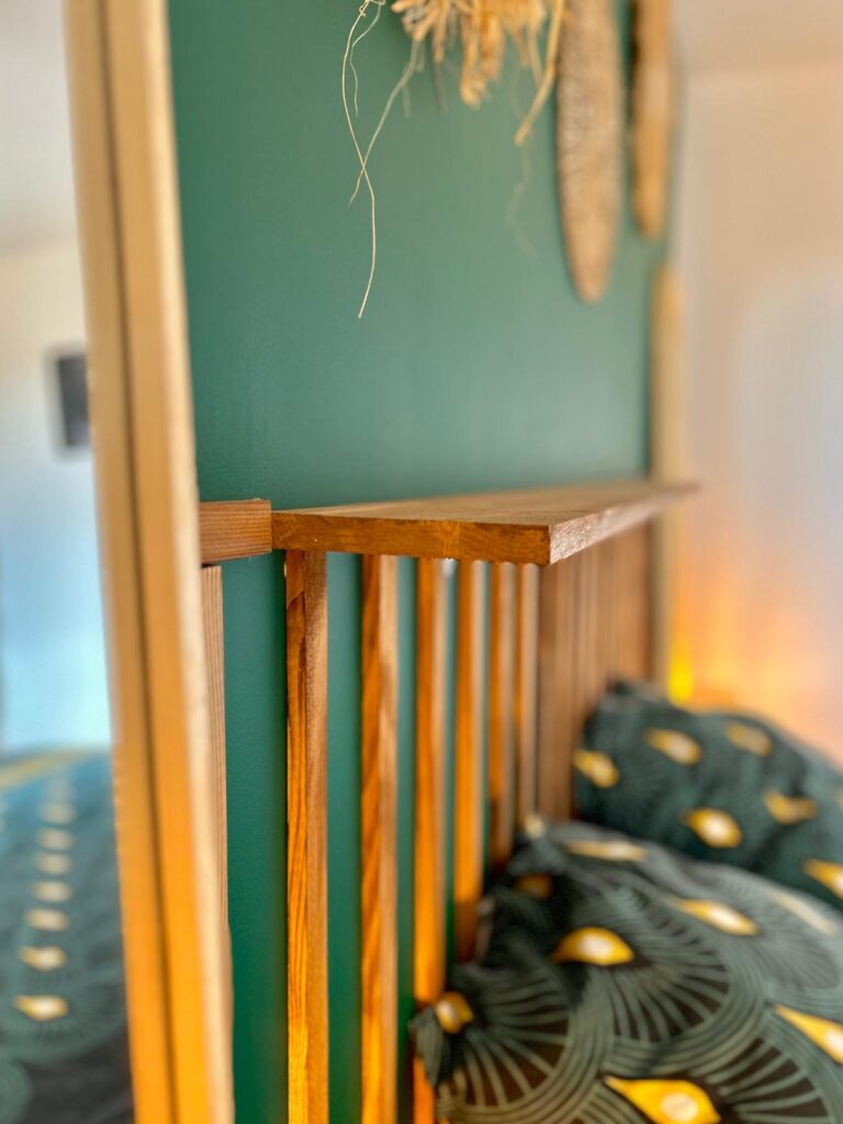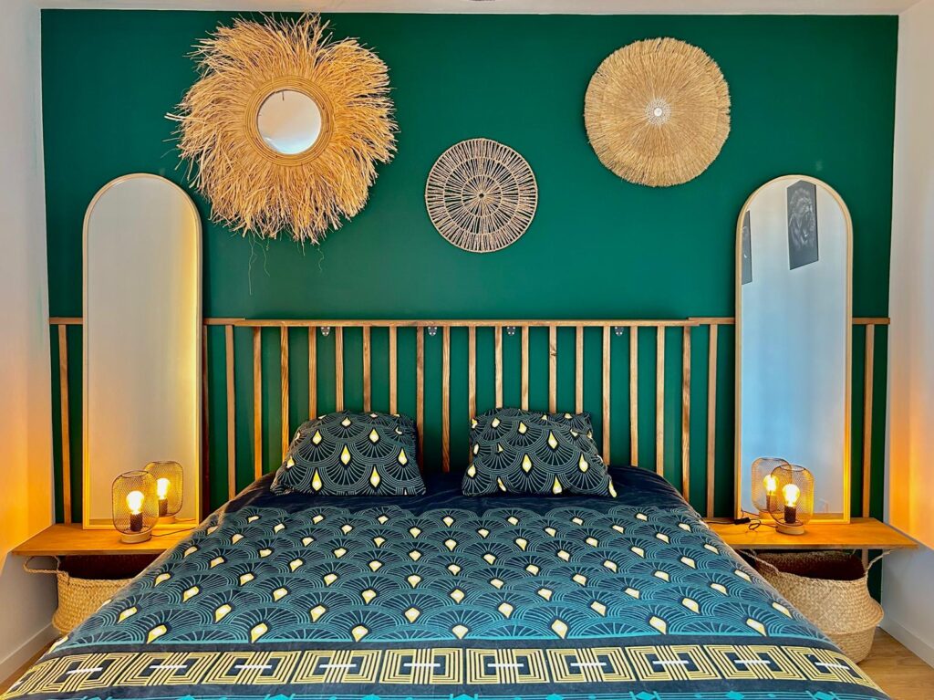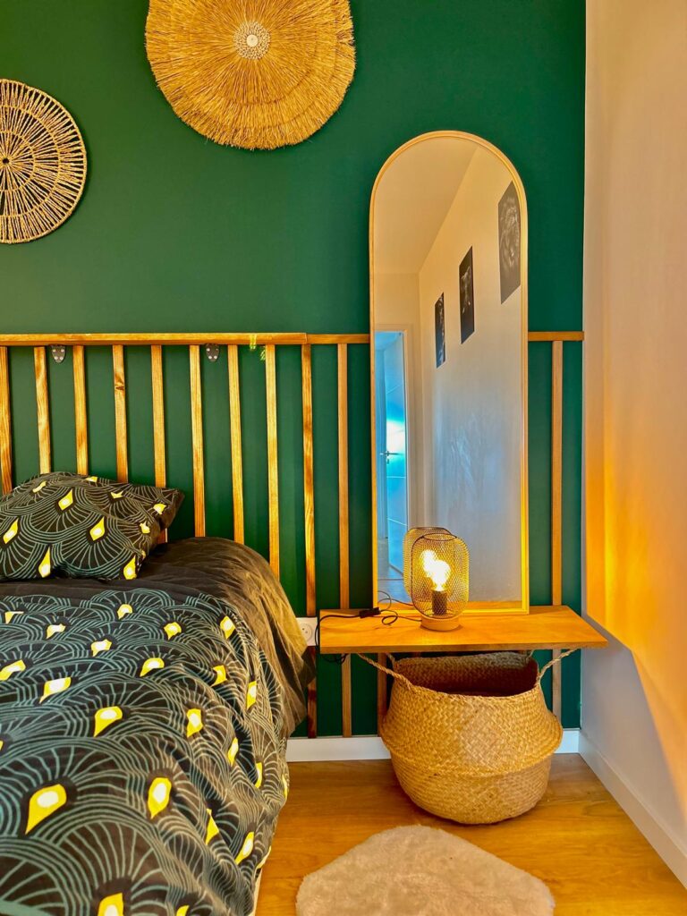 La chambre a été métamorphosée dans un esprit inspiré de l’Amérique du Sud, où les couleurs vibrantes prennent vie. Un vert foncé habille les murs, accentué par des touches de bois et de jaune bouton d’or. Au cœur de cet espace, la tête de lit en bois sur mesure devient le point focal, accompagnée de ses tables de nuit flottantes. De part et d’autre de la tête de lit, deux miroirs en symétrie viennent agrandir visuellement l’espace. L’ensemble de ces éléments combine harmonieusement pour créer une chambre à la fois unique et douce.
