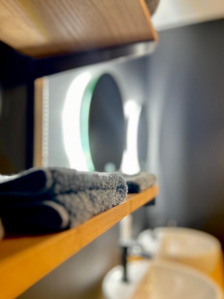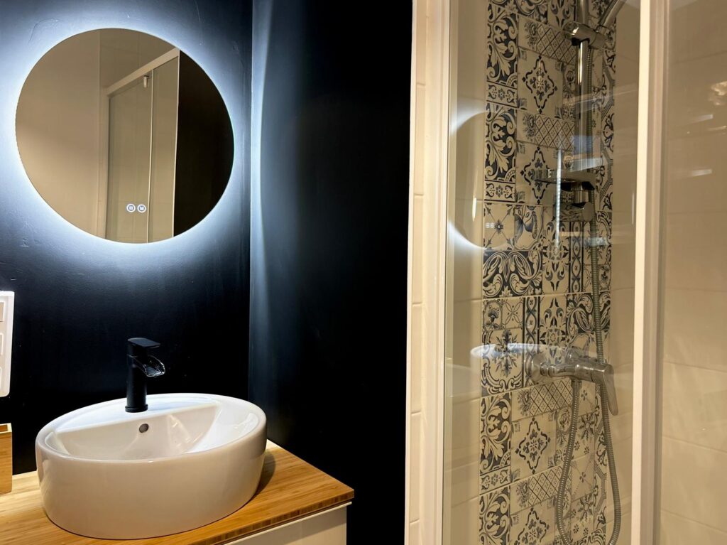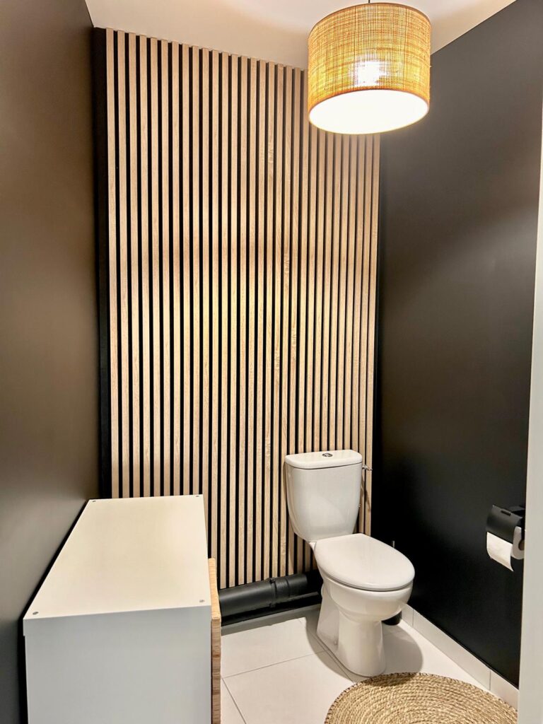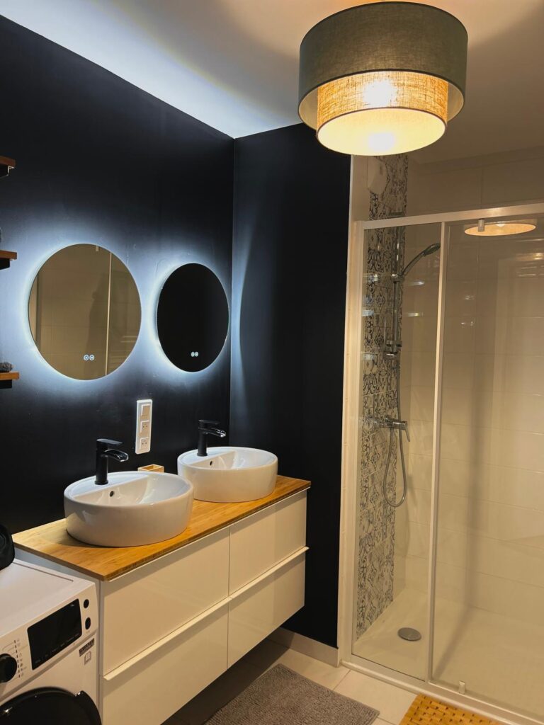La salle de bain a été repensée pour inclure une double vasque et deux miroirs rétroéclairés, offrant ainsi un espace fonctionnel et élégant. Le noir est la vedette, ajoutant une nouvelle dimension et mettant en valeur chaque élément, des vasques aux accessoires. Des étagères ajoutent de la fonctionnalité en accueillant les serviettes de bain et autres accessoires. Les toilettes, pensées en harmonie avec la salle de bain dans le même noir profond, ajoutent une continuité esthétique à l’ensemble. Pour une touche de chaleur, un tapis en coco et des tasseaux finition chêne ont été ajoutés, apportant ainsi une note d’authenticité et de confort à cet espace. Les luminaires arborent un design similaire, habillé dans la salle de bain d’une partie de tissu vert émeraude, ajoutant ainsi une subtile nuance de couleur.