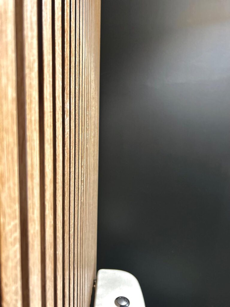 Dans ce projet, l’entrée est minimaliste : des patères en cèdre pour suspendre les manteaux, un meuble de rangement fin pour les chaussures et un miroir en laiton doré. Poursuivant le regard, une grande ouverture s’étirant jusqu’au plafond attire l’œil vers la pièce de vie et sa grande hauteur.